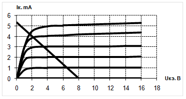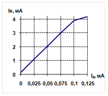 | Iк. mА | 0,1 | 1,1 | 2,05 | 3 | 3,9 | 4,2 |