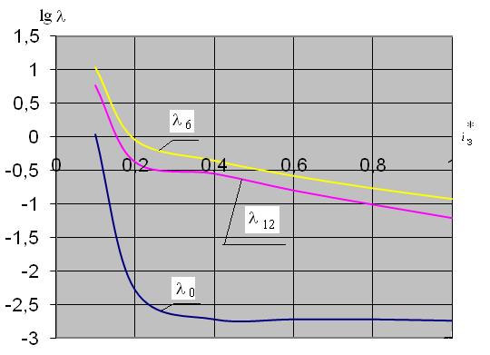 Нелинейность вольтамперной характеристики дуги проявляется в работе регулятора том, что минимально допустимое значение постоянной времени короткой сети Tк* зависит не только от величины и частоты пульсаций выпрямленного напряжения, но и от задания тока i*з регулятора. На основании анализа условий зажигания дуги при различных значениях задания тока и частоты пульсаций выпрямленного напряжения были получены сравнительные зависимости необходимого превышения постоянной времени Tк короткой сети относительно постоянной времени выпрямителя Tп - λ = Tк/Tп , приведенные на рис. 9. Оказалось, что диапазон изменения минимально допустимой постоянной времени короткой сети Tк от задания тока i*з очень велик, поэтому зависимости на рис. 9 для наглядности сравнения построены в логарифмическом масштабе.