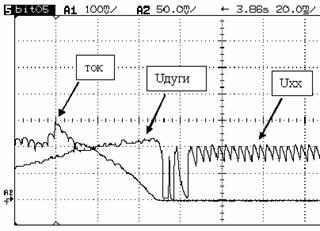 Процесс на рис.5,а показывает невыполнение критерия i>0. Осциллограмма рис.5,б иллюстрирует процесс при котором критерий выполняется. По переходным функциям вида рис.5 для режима зажигания дуги определялись граничные значения параметров системы, включающей в себя источник питания, регулятор тока и короткую сеть. Посредством таких переходных функций в диалоговом режиме может быть осуществлен синтез системы регулирования тока для каждой конкретной установки.