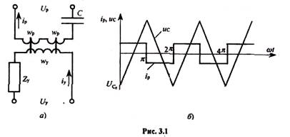 Формування таких імпульсів напруги на ємності виникає за умови, якщо незначний сигнал управління Іу викликає насичення одного з осердь. Це призводить до того, що конденсатор С буде періодично перезаряджатись струмом з постійною амплітудою (рис. 3.1, б). З урахуванням цієї обставини напруга на конденсаторі на протязі одного півперіоду може бути визначена за формулою: