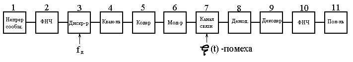 Аналогово-цифровой преобразователь (АЦП) преобразует непрерывное сообщение в цифровую форму. Это преобразование состоит из трех операций: сначала непрерывное сообщение подвергается дискретизации по времени через интервал; полученные отсчеты мгновенных значений квантуются (Квант.); полученная последовательность квантованных значений передаваемого сообщения представляется в виде последовательности двоичных кодовых комбинаций посредством кодирования.