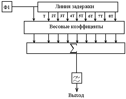 Импульсы последовательности S1(t) поступают на линию задержки, имеющую отводы через каждые t интервалы, далее на фазовращающие каскады и схему суммирования.