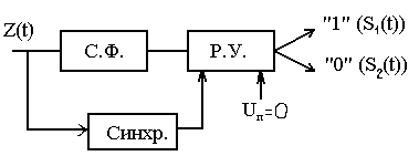 При синхронном способе приема Uп=0, за счет синхронизации сигнал в решающей схеме сравнивается с Uп=0 в момент времени to=Tc, когда функция корреляции имеет значение максимума.