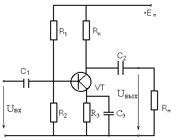 Задание: Требуется рассчитать однокаскадный усилитель на биполярном транзисторе, схема которого приведена ниже. В этой схеме тип транзистора определяется полярностью заданного напряжения.