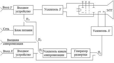 Сигналы от входного устройства Y или Х поступают на генератор развертки через усилитель синхронизации. С помощью переключателя П2 генератор развертки может быть исключен из канала X. Тогда на горизонтально отклоняющие пластины подается напряжение, пропорциональное сигналу на входе X.
