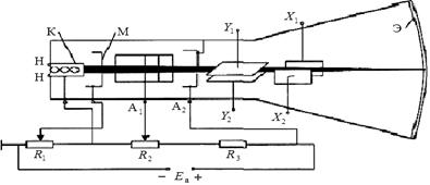 Основным блоком осциллографа является электронная лучевая трубка (ЭЛТ). Катод К в трубке служит источником электронов. Электроны собираются в узкий луч при помощи электрического или магнитного поля специальных электродов или катушек с током. Электронный луч фокусируется на экране, который образуется внутренней стороной стеклянного баллона трубки, покрытой люминофором. Схематическое устройство ЭЛТ с электростатическим управлением приведено на рис.2.