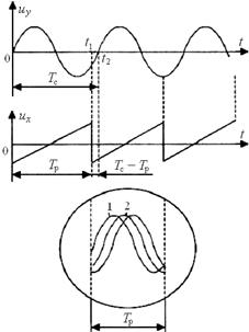 Пусть на входе Y появляется напряжение u(t). Благодаря напряжению генератора развертки на экране будет наблюдаться развертка исследуемого напряжения во времени. Для получения устойчивого изображения необходимо синхронизировать напряжение генератора развертки с исследуемым сигналом. Допустим, что напряжение сигнала u(t) изменяется во времени по синусоидальному закону, период ТС которого отличается от периода напряжения развертки ТР (рис.3). В этом случае по окончании периода развертки луч не вернется в исходное положение, т.к. u(t1 ) не вернулось в нулевое значение. Второму периоду развертки будет соответствовать кривая 2, смещенная на экране относительно кривой 1 на величину ∆T = ТС – ТР , и т.д. На экране наблюдается «бегущая синусоида».