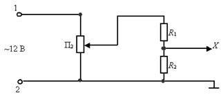 Делитель напряжения (рис.4.) представляет собой цепь из двух последовательно включенных резисторов. Цепь подключается к источнику напряжения. С одного из плеч снимается выходное напряжение, которое получается меньше входного, т.е. ослабляется.