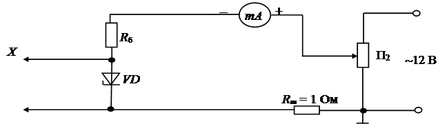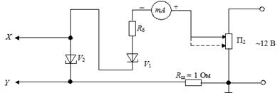 Выходные характеристики снимаются при изменяющемся токе коллектора. Для этого в цепь коллектора подается положительная полуволна напряжения, которая получается в результате однополупериодного выпрямления напряжения ~6,3 В. Схема включения приведена на рис.14.