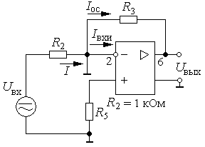 Пусть операционный усилитель является идеальным усилителем напряжения, тогда ток iвх u = 0. Точка 2 является виртуальным нулем, поэтому i = ioc .
