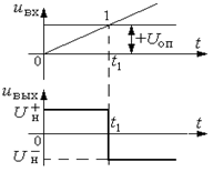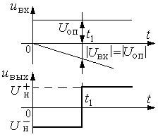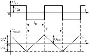 Если на вход усилителя подается прямоугольное знакопеременное напряжение, то на выходе получается пилообразное напряжение. Временные диаграммы, иллюстрирующие работу усилителя, приведены на рис.3.