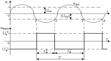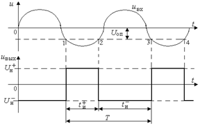 При построении рис.3 начальное напряжение Uвых (0) принято равным 0. Амплитудное значение выходного напряжения Uп m достигается за четверть периода Т прямоугольного сигнала или половину длительности импульса tu :