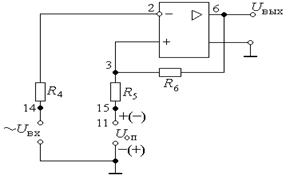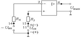 Собрать схему согласно рис.1. При отсутствии входного сигнала добиться нулевого значения выходного напряжения. Напряжение на выходе контролировать при помощи осциллографа.