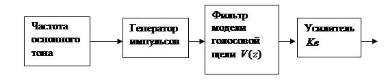 В случае вокализованных звуков источник возбуждения должен формировать квазипериодическую последовательность импульсов с частотой основного тона. Поэтому модель возбуждения для случая вокализованных звуков можно представить в виде (рис. 6):