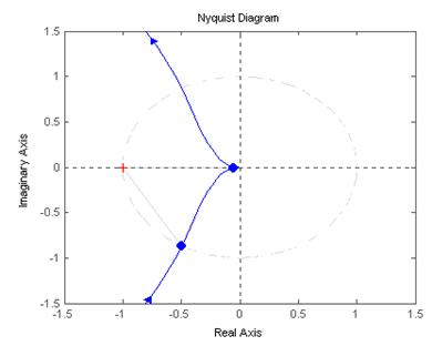 С помощью годографа Найквиста найдем запасы по амплитуде и фазе (рисунок 4.3).