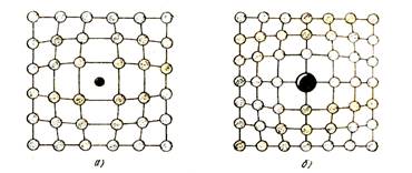 Рис.1.1 Искажение кристаллической решетки в твердых растворах внедрения (а) и замещения (б)