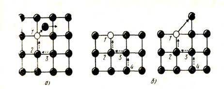 Помимо внутреннего испарения, возможно полное или частичное испарение атомов с поверхности кристалла. При полном испарении атом покидает поверхность кристалла и переходит в пар, при частичном испарении он с поверхности переходит в положение над поверхностью (рис.1.2, б). В обоих случаях в поверхностном слое кристалла образуется вакансия. Путем замещения глубже лежащим атомом вакансия втягивается внутрь кристалла. Такое образование вакансий не сопровождается одновременным внедрением атомов в междоузлия, т.е. появлением дислоцированных атомов. Такого рода вакансии называют дефектами по Шоттки. Их источником могут быть и всевозможные несовершенства кристалла: недостроенные атомные плоскости, границы блоков и зерен, микроскопические трещины и др.