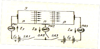 Если выключатель SA1 разомкнуть, а выключатели SA2 и SA3 замкнуть, то в коллекторной цепи пройдет незначительный обратный ток, вызываемый направленным движением не основных носителей заряда - дырок базы и электронов коллектора. Путь тока: +Е2 , выключатели SA3 и SA2, миллиамперметр РА2, база, коллектор, миллиамперметр РАЗ, - Е2 .