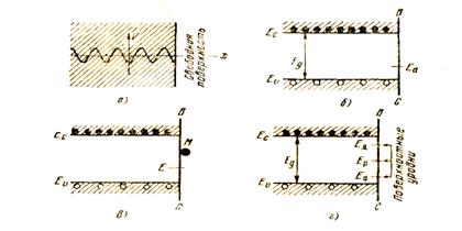 Подобными дефектами являются и свободные поверхности кристалла, на которых происходит обрыв решетки и нарушение периодичности ее потенциала (рис.3.1, а). Влияние такого рода дефектов на энергетический спектр электронов было исследовано Таммом в 1932 г. Он показал, что обрыв решетки приводит к появлению в запрещенной зоне полупроводника разрешенных дискретных уровней энергии для электронов, расположенных в непосредственной близости от поверхности кристалла (рис.3.2, б). Такие уровни получили название поверхностных уровней или поверхностных состояний.