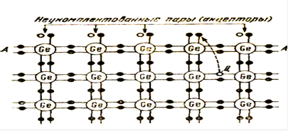 Наглядное представление о возникновении поверхностных состояний можно получить из рассмотрения связей, действующих между атомами в объеме и на поверхности кристалла. На рис.3.2 изображена плоская модель решетки германия. Атом в объеме кристалла окружен четырьмя ближайшими соседями, связь с которыми осуществляется путем попарного обобществления валентных электронов. У атомов, расположенных на свободной поверхности АА , одна валентная связь оказывается разорванной, а электронная пара неукомплектованной. Стремясь укомплектовать эту пару и заполнить свою внешнюю оболочку до устойчивой восьмиэлектрон-ной конфигурации, поверхностные атомы ведут себя как типичные акцепторы, которым в запрещенной зоне соответствуют акцепторные уровни Еа (рис.3.1, б). Электроны, попавшие на эти уровни из валентной зоны, не проникают в глубь кристалла и локализуются на расстоянии порядка постоянной решетки от поверхности. В валентной зоне возникают при этом дырки, а в поверхностном слое полупроводника - дырочная проводимость.