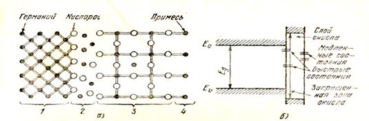 Рис.3.3 Структура поверхностного слоя германия (а) и расположение быстрых и медленных поверхностных состояний (изгиб зон у поверхности не показан) (б): 1 - германий; 2 - переходный слой; 3 - окисный слой; 4 - адсорбированные примеси.