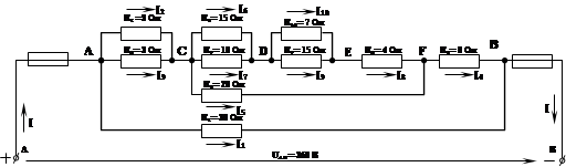 Решение: Начертим эквивалентную схему. Обозначим узлы цепи буквами А, В, С, D, E, F. Покажем направление токов во всех участках цепи. Индексы токов и напряжений для каждого сопротивления должны быть такими, как индекс сопротивления.