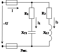 Задача № 3. Цепь переменного тока, схема которой приведена на рис., содержит различные элементы сопротивлений, образующие две параллельные ветви. Определить токи в ветвях; ток в неразветвленной части цепи I; активную мощность Р, реактивную Q и полную мощность цепи S; коэффициент мощности Cos φ, напряжение цепи U, если задано: R1 = 4 Ом; R2 = 6 Ом; XL2 =8 Ом; XC1 =3 Ом; P1 = 256 Вт;