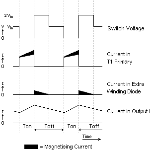 Дополнительная обмотка трансформатора прямоходового преобразователя гарантирует, что к моменту включения ключа магнитное поле сердечника трансформатора нулевое. При отсутствии дополнительной обмотки после нескольких периодов переключения сердечник трансформатора войдет в насыщение, ток первичной обмотки чрезмерно увеличится, таким образом ключ (то есть транзистор) выйдет из строя.
