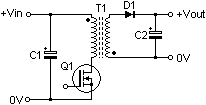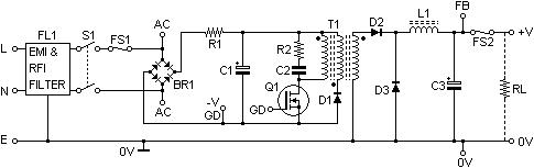 Конденсатор при питании от сети переменного тока 220 В заряжается до напряжения приблизительно 310 В (340 В для 240 В). Резистор R1 - низкоомный (номинал от 2 до 4 Ом), который предохраняет схему от бросков тока при заряде конденсатора C1 во время подачи питания. Q1 - высоковольтный МОП-транзистор, который используется в качестве быстродействующего ключа, переключающего импульс питающего тока в ферритовом высокочастотном трансформаторе T1. Частота переключения обычно лежит в диапазоне от 25 до 250 кГц. Элементы R2 и C2 составляют защитную цепь (snubber), которая уменьшает выбросы напряжения и шумы переключателя. Стабилизация достигается благодаря контролю за выходным напряжением в точке "FB" и регулирования ширины входных импульсов драйвера ключа Q1. Предохранитель FS2 необходим для защиты от короткого замыкания и перегрузки. FS2 иногда заменяется датчиком тока, который запирает при перегрузке драйвер ключа Q1.