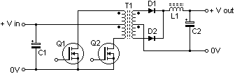 Двухтактный преобразователь относится к числу прямоходовых. Как показано на рисунке 5, когда ключ Q1 включен, ток течет через верхнюю половину первичной обмотки T1 и магнитное поле в сердечнике T1 растет. Растущее магнитное поле в T1 индуцирует напряжение во вторичной обмотке T1 такой полярности, что диод D2 смещен в прямом, а D1 - в обратном направлении. D2 проводит и заряжает выходнй конденсатор C2 через дроссель L1. L1 и C2 составляют схему фильтра. Когда ключ Q1 выключается, магнитное поле в трансформаторе T1 спадает, и после времени паузы (зависящего от скважности ШИМ), Q2 включается, ток течет через нижнюю половину первичной обмотки T1 и магнитное поле в сердечнике T1 растет в противоположном направлении. Растущее магнитное поле в T1 индуцирует напряжение во вторичной обмотке T1 такой полярности, что диод D1 смещен в прямом, а D2 - в обратном направлении. D1 проводит и заряжает выходной конденсатор C2 через дроссель L1. После окончания мертвого времени включается ключ Q1 и процесс повторяется.