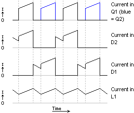 Если Vin увеличивается, схема управления уменьшит скважность, чтобы сохранить постоянное выходное напряжение. Аналогично, если ток нагрузки уменьшится и Vout увеличится, схема управления будет действовать таким же образом. Наоборот, уменьшение Vin или увеличение тока нагрузки увеличит скважность. Временные диаграммы на рисунке 6 показывают токи двухтактного преобразователя.