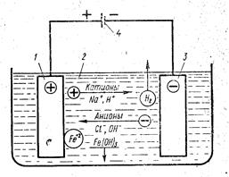Схема движения ионов в наиболее часто применяемом для ЭХО электролите – водном растворе хлористого натрия NaCl– приведена на рисунке 1. при растворении хлористого натрия в воде его молекула распадается на катион натрия Na+ и анион хлора Cl– . Вода Н2 О при этом также частично диссоциирует на катионы водорода Н+ и анионы гидроксила ОН– . При подаче на электроды напряжения от источника питания анионы гидроксила и катионы водорода вместе с анионами хлора и катионами натрия вынуждены под действием сил электрического поля перемещаться соответственно к катоду и аноду. Атомы поверхностного слоя электрода-анода 1, получая от движущихся к нему анионов хлора и гидроксила дополнительные отрицательные заряды, превращаются в положительные ионы железа. Последние под действием сложных катодных и анодных реакций взаимодействуют с ионами гидроксила и образуют гидрат окиси железа Fe(OH)3 , который в виде нерастворимого химического соединения выпадает в осадок. Таким образом, происходит электрохимическое анодное растворение железа. Одновременно с этим на катоде выделяется водород, выходящий из электролита в виде пузырьков. Реакции, протекающие на катоде, как правило, не разрушают его, т.е. катод при ЭХО не изнашивается.