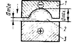 Так, напряжение, подводимое к электродам, можно повысить до значений, при которых наступает электрический пробой межэлектродного промежутка. При этом с возникновением электрического пробоя образуется электрический разряд, называемый дугой. Под действием этой дуги происходит нежелательное локальное выплавление электрода-инструмента и заготовки иногда глубиной до 10 мм. Поэтому, чтобы исключить такое явление, электрохимическое формообразование ведут, как правило, при напряжении 15-20 В. В некоторых случаях напряжение на электродах повышают до 30 В, например, при больших межэлектродных промежутках (2-3 мм). Чтобы снизить производительность размерной ЭХО, напряжение на электродах принимают равным 2-2,5 В; при меньших значениях электрического напряжения анодное растворение прекращается.