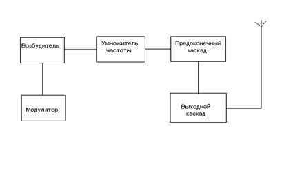 Составление блок-схемы передатчика начинается с выходного каскада начинается с выходного каскада. Данные, определяющие его мощность, содержатся в задании. Также задается колебательная мощность в антенне в режиме несущей частоты. В данном передатчике необходимо применить умножитель частоты, в качестве которого может работать предоконечный или дополнительный предварительный каскад, включаемый между возбудителем и предоконечным каскадом. Вид блок-схемы передатчика с частотной модуляцией представлен на рисунке: