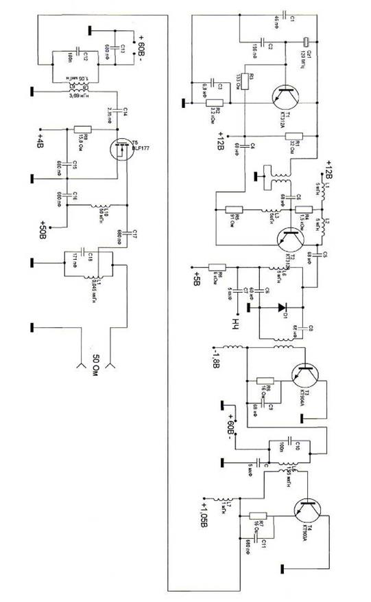 Для согласования с пятидесятиомной нагрузкой нужна схема с неполным включением индуктивности, при этом, емкость конденсатора в колебательном контуре рекомендуется брать