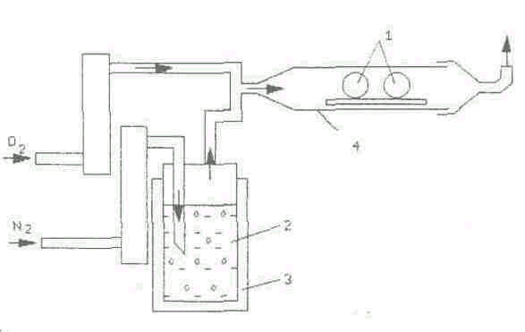 Головна відмінність окислен ня в вологому кисні в ід процесу, який протікає в сухому кисні, або в парах води, полягає в легкій зміні концентрації окислювача. П ри окисленні в потоці водяної пари окислюв аче м є в ода при парціальному тиску 1 атм, при окисленні в сухому кисн і - кисень при тиску 1 атм. В установ ці для окислення у вологому кисні, як окислювач використовується суміш води і кисню, причому співвідношення цих компонентів припускає зміни. В принципі можна змінювати швидкість окислення від величини, що відповідає 1 00% вмісту кисню, до величини, що відповідає 100% вмісту води. Застосувавши аргон або азот як газ-носій та знизивши температуру ба рботера до 290 К, досягнемо меншої швидкості окислення, ніж в сухому кисні. Практично температура барботера був ає не нижчою від кімнатної , а потік газу- носія складає не менше 200 см /хв для реактора діаметром 150 мм.