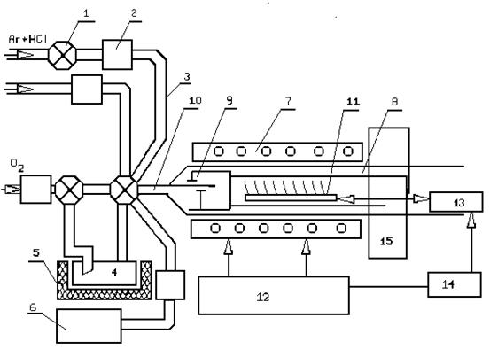 Як згадано в [6,7] для барботування використовується вихідний розчин хлориду цинку концентрації 1 - 3%, або, при миттєвому випаровуванні розчину в реакторі, 0,001 - 0,025% розчин. В цьому випадку готується вихідний 1% розчин ZnCl2 , який потім розводиться деіонізованою водою до необхідної концентрації. Миттєве випаровування попередньо приготованого розчину здійснюється шляхом введення його в реактор через капіляр з витратою 10 мл/хв.