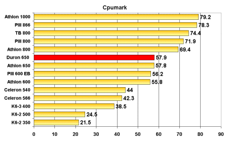 Согласно CPUmark, Duron немного быстрее, чем Athlon 650. CPUmark, в общем-то, не совсем отражает реальное положение вещей. Этот тест делает несколько идеализированный, но мы все же можем заключить, что Duron и Athlon 650 работают с целочисленными задачами более-менее ровно по отношению друг к другу.