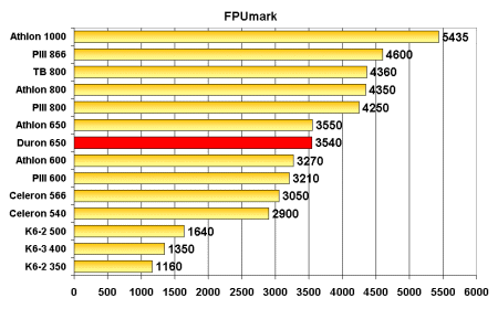 FPUmark подтверждает это еще раз: Athlon 650 и Duron должны стоять совсем близко друг к другу при выполнении операций с плавающей точкой.