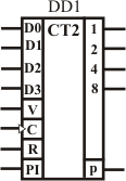 Вот типичный счетчик с предустановкой. СТ2 означает, что счетчик двоичный, если он десятичный, то ставится СТ10, если двоично-десятичный - СТ2/10. Входы D0 - D3 называются информационными входами и служат для записи в счетчик какого-либо двоичного состояния. Это состояние отобразится на его выходах и от него будет производится начало отсчета. Другими словами, это входы предварительной установки или просто предустановки. Вход V служит для разрешения записи кода по входам D0 - D3, или, как говорят, разрешения предустановки. Этот вход может обозначаться и другими буквами. Предварительная запись в счетчик производится при подаче сигнала разрешения записи в момент прихода импульса на вход С. Вход С тактовый. Сюда запихивают импульсы. Треугольник означает, что счетчик срабатывает по спаду импульса. Если треугольник повернут на 180 градусов, т. е. задницей к букве С, значит он срабатывает по фронту импульса. Вход R служит для обнуления счетчика, т. е. при подаче импульса на этот вход на всех выходах счетчика устанавливаются лог. 0. Вход PI называется входом переноса. Выход p называется выходом переноса. На этом выходе формируется сигнал при переполнении счетчика (когда на всех выходах устанавливаются лог. 1). Этот сигнал можно подать на вход переноса следующего счетчика. Тогда при переполнении первого счетчика второй будет переключаться в следующее состояние. Выходы 1, 2, 4, 8 просто выходы. На них формируется двоичный код, соответствующий числу поступивших на вход счетчика импульсов. Если выводы с кружочками, что бывает намного чаще, значит они инверсные, т. е. вместо лог. 1 подается лог. 0 и наоборот. Более подробно работа счетчиков совместно с другими устройствами будет рассматриваться в дальнейшем.