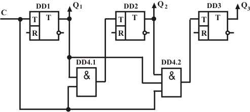 Разряды счетчика – триггеры DD1, DD2, DD3.