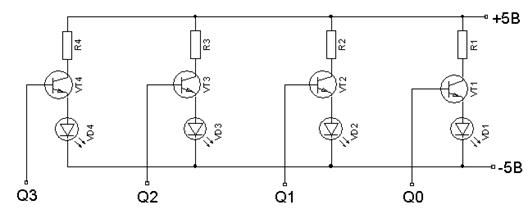 Для отображения результата счёта необходимо использовать светодиоды. Чтобы осуществить такой вывод информации можно воспользоваться простейшей схемой. Схема блока индикации на светодиодах приведена на рисунке 10.