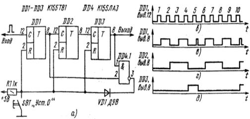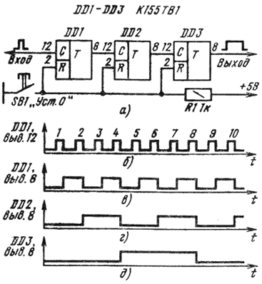 Если в начальный момент все триггеры счетчика находились в нулевом состоянии (можно установить кнопочным выключателем SB1 «Уст.0», подавая на вход R триггеров напряжение низкого уровня), то по спаду первого же импульса (рис. 45,6) триггер DD1 переключится в единичное состояние—на его прямом выходе появится высокий уровень напряжения (рис. 45,в). Второй импульс переключит триггер DD1 в нулевое состояние, а триггер DD2—B единичное (рис. 45,г). По спаду третьего импульса триггеры DD1 и DD2 окажутся в единичном состоянии, а триггер DD3 все еще будет в нулевом. Четвертый импульс переключит первые два триггера в нулевое состояние, а третий в единичное (рис. 45,д). Восьмой импульс переключит все триггеры в нулевое состояние. По спаду девятого входного импульса начнется следующий цикл работы трехразрядного счетчика импульсов.