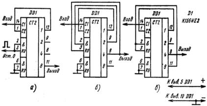 На практике функции счетчиков импульсов и делителей частоты выполняют специально разработанные микросхемы повышенной степени интеграции. В серии К155, например, это счетчики К155ИЕ1, К155ИЕ2, К155ИЕ4 и др.