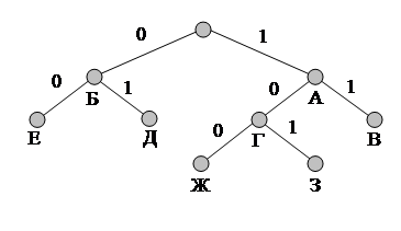 Для того, чтобы построить кодовое дерево для данного кода, начиная с некоторой точки - корня кодового дерева - проводятся ветви - 0 или 1. На вершинах кодового дерева находятся буквы алфавита источника, причем каждой букве соответствуют своя вершина и свой путь от корня к вершине . К примеру, букве А соответствует код 000, букве В – 010, букве Е – 101 и т.д.