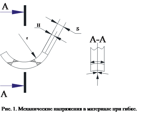 Одной из особенностей гибки, является искажение поперечного сечения деталей в месте гибки (рис.1), которое заметно тем значительнее, чем более узкая полоса подвергается изгибу. Там возникают внутренние напряжения, которые могут привести к трещинам, если не будет учтен минимально допустимый радиус гибки (рис. 2). Минимальный радиус изгиба зависит от многих факторов, например, от толщины и марки материала, состояния материала при поставке, способа гибки угла изгиба, ориентации.