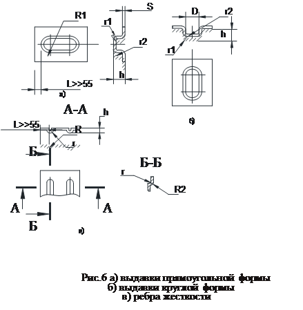 В несущих конструкциях электронных систем широкое распространение получили выдавки, отбортовки, ребра жесткости, которые позволяют увеличить жесткость тонколистового материала и повысить теплообмен. Выдавки прямоугольной формы применяют как опорные площадки для крепления тяжелых узлов, а круглой – для крепления амортизаторов (рис. 6)