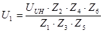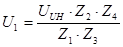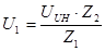 Если напряжение источника наводки равно UUH , то в результате действия первого делителя, состоящего из Z1 и Z2 , напряжение снизится до величины: