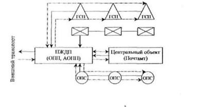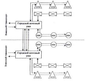 Обработка исходящих и входящих потоков почты в городах являющихся крупными промышленными центрами, производится в ПЖДП, ОПП, АОПП, которые выполняют функции городских почтовых узлов. В остальных городах обработкой внутригородских потоков почты занимаются Почтамт или ГУПС.