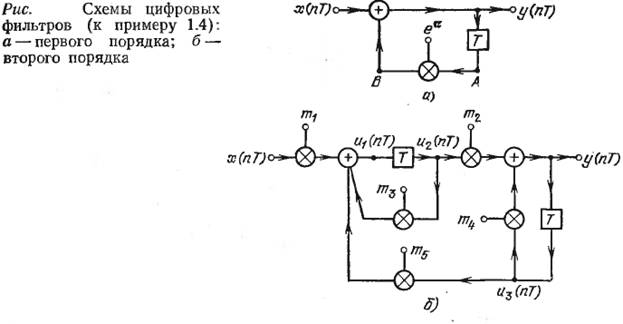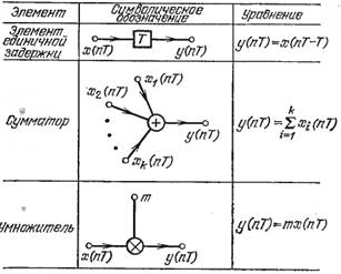 Схемы цифровых фильтров представляются в виде множества элементов единичной задержки, сумматоров и умножителей, соединенных между собой. Анализ этих схем обычно несложен и его можно осуществить, используя уравнения элементов, приведенные в табл. 1.1.